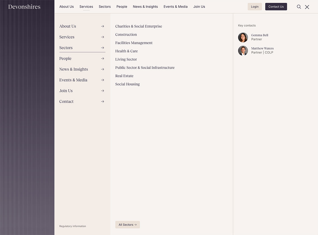 Devonshires are a firm of solicitors that have been based in the City of London for over 150 years, they are a leading practice providing high-quality, accessible services to domestic and international clients, including developers, local authorities, housing associations and financial services firms. We worked on this project with our partner agency, Ascend Studio, who rebranded the firm.